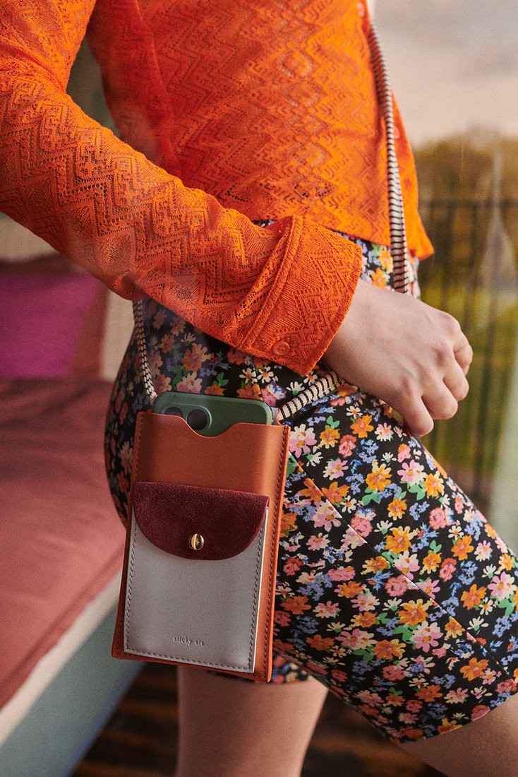 Etui na telefon Hortensia Blue z kolekcji holenderskiej marki The Sticky Sis Club. Etui wykonane jest ze skóry ekologicznej, posiada bawełniany pasek. Z przodu znajduje się mała kieszonka z zamszu z dwoma przegródkami. Z tyłu etui  posiada miejsca na 3 karty.