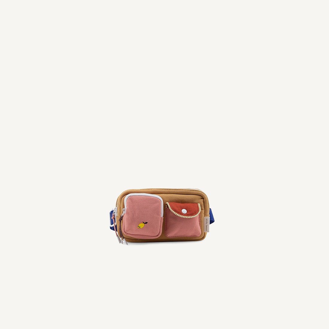 Fanny Pack Cousin Clay z kolekcji holenderskiej marki Sticky Lemon. Nerka wykonana jest z grubej bawełny i  z przodu posiada 2 dodatkowe kieszonki – jedną na nap, drugą na suwak. Wewnątrz wyłożona jest wodoodpornym materiałem we wzór w żołędzie. Posiada regulowany pasek.