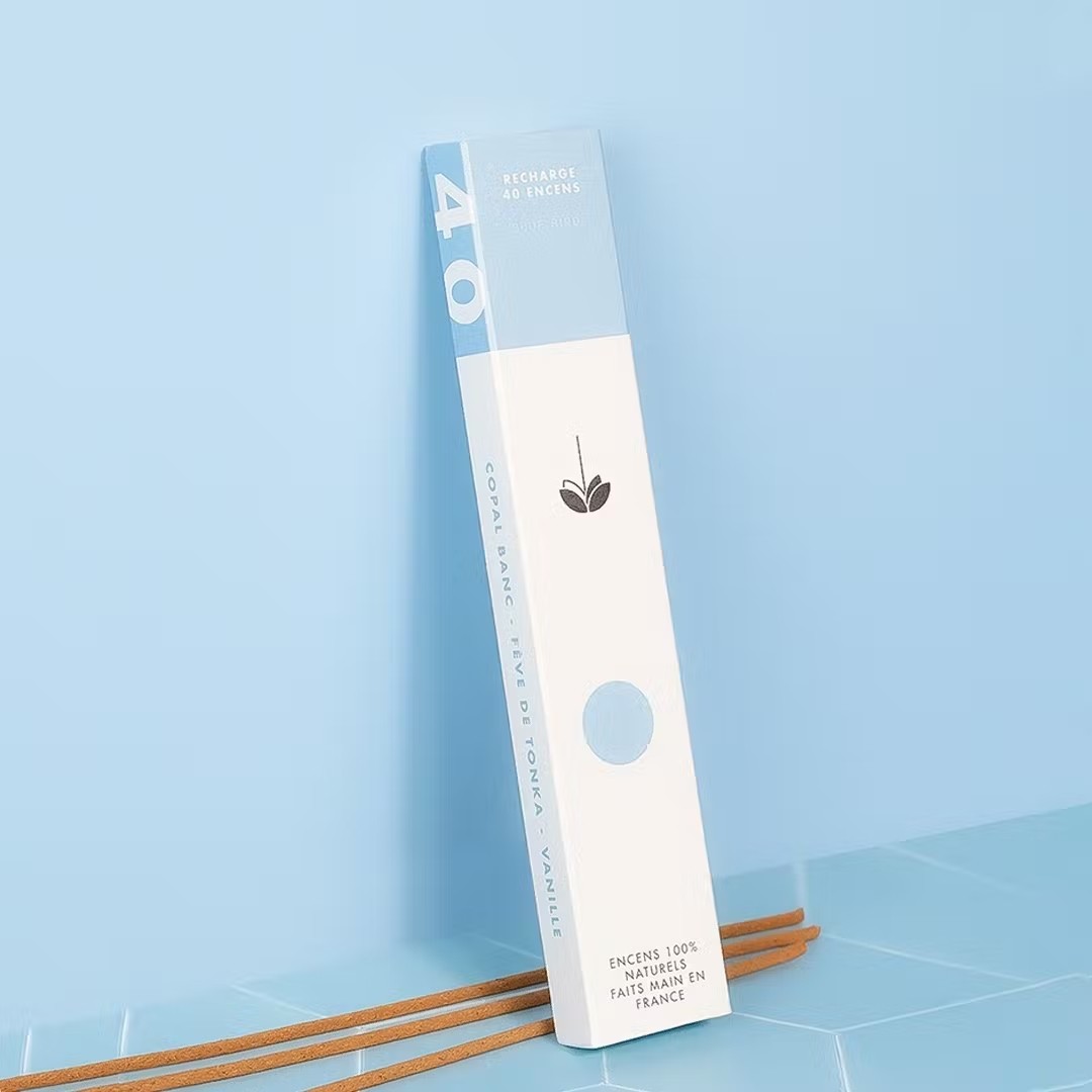 Kadzidełka Blue Bird zapas to 40 naturalnych kadzideł laskowych – biały kopal, bób tonka, wanilia. W całości ręcznie wykonane we Francji, w 100% naturalne, bez dopalaczy, syntetycznych zapachów, barwników, tłuszczu zwierzęcego. W 100% wegańskie.