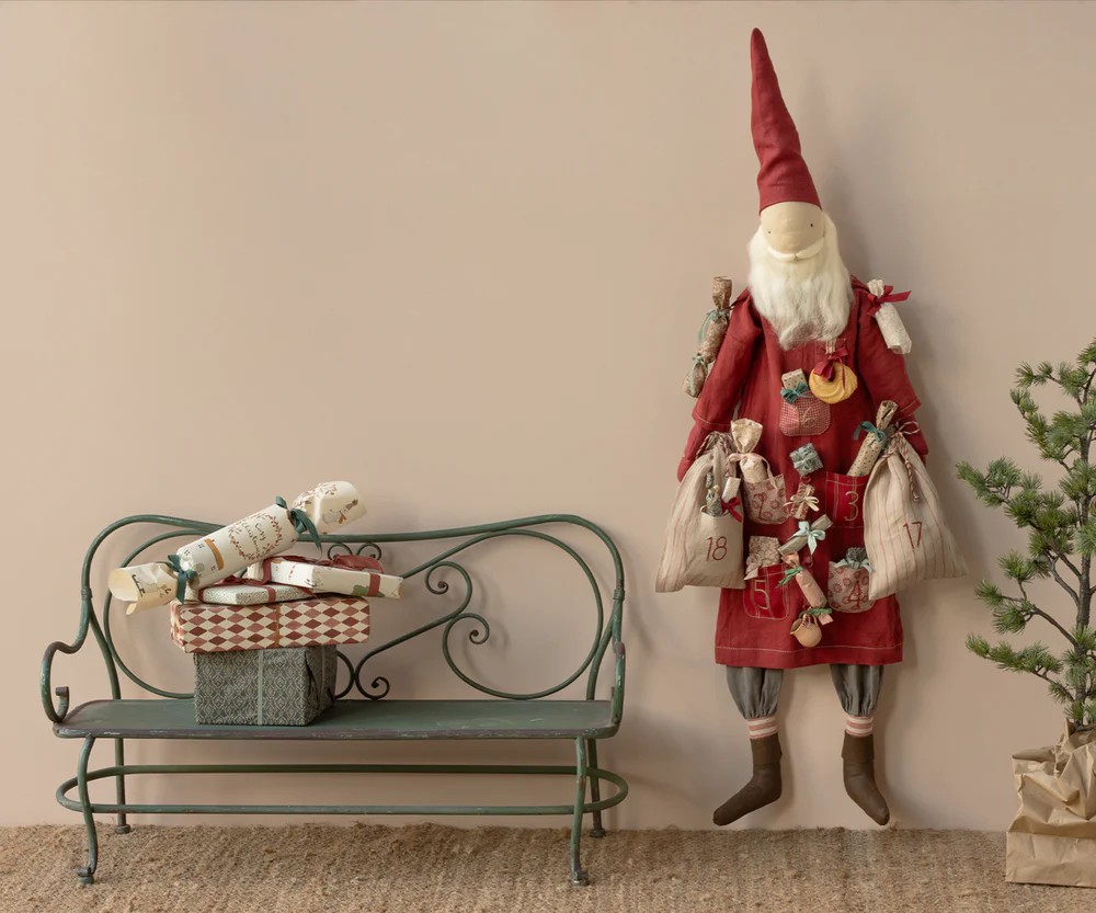 Magia świąt dzień po dniu. Duży kalendarz adwentowy w kształcie Mikołaja z kieszonkami i haczykami do powieszenia 24 małych niespodzianek – na każdy dzień grudnia. Ręcznie haftowane detale i naturalne materiały tworzą wyjątkowy klimat. Z tyłu znajduje się haczyk do zawieszenia na ścianie lub drzwiach.