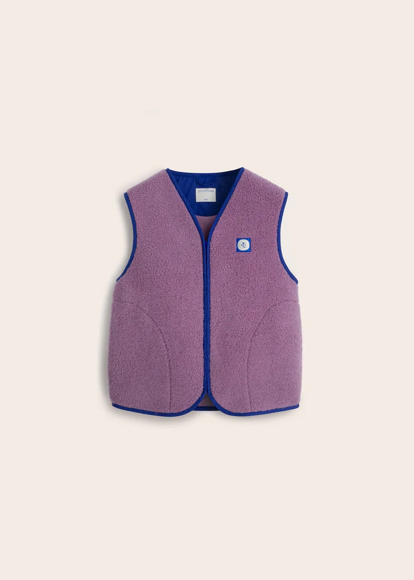 Luźny, pudełkowy krój zapewnia komfort i swobodę ruchów, a zapięcie na suwak ułatwia noszenie. Kobaltowa lamówka podkreśla linię kamizelki, a naszywka z logo dodaje jej charakteru. Całość wykończona z dbałością o każdy detal – w środku wszystkie szwy są obszyte, a tkana wszywka z miejscem na imię to subtelne nawiązanie do wersji dziecięcej.
