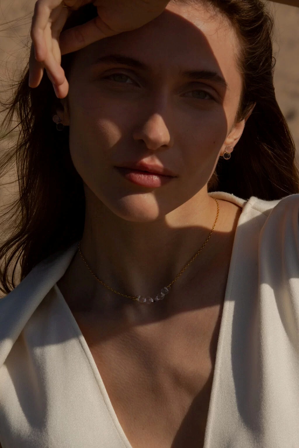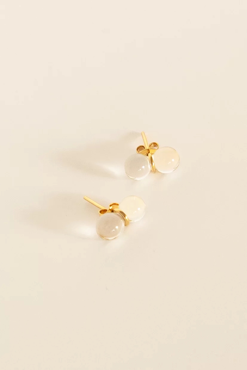 Kolczyki Duo są częścią najnowszej kolekcji KROPLA autorstwa Magdaleny Paszkiewicz. Motywem kolekcji jest poszukiwanie balansu pomiędzy nieregularnością wody a geometrycznymi kształtami lodu. Użyte w kolekcji szkło przywodzi na myśl kroplę i zamknięcie jej w prostej, a zarazem miękkiej formie. To jednocześnie balans i płynność, delikatność i geometria, woda i lód.