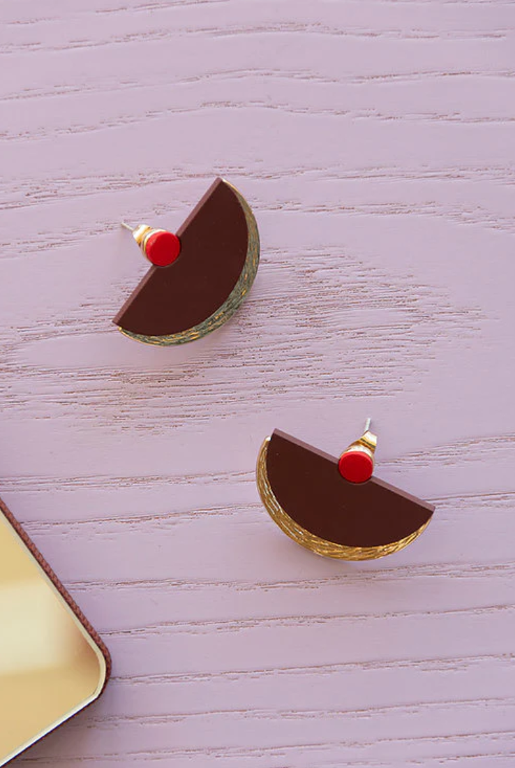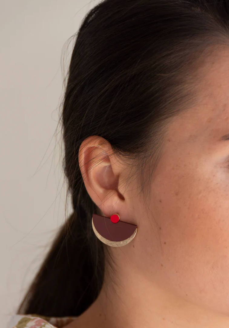 Kolczyki Sunrise to kolczyki z kolekcji holenderskiej marki The Sticky Sis Club. Kolczyki są wykonane ze sztywnego, ale miękkiego w dotyku materiału kolorach wine red i poppy red. Sztyfty kolczyków wykonane są ze srebra. Kolczyki mają kształt półkola.
