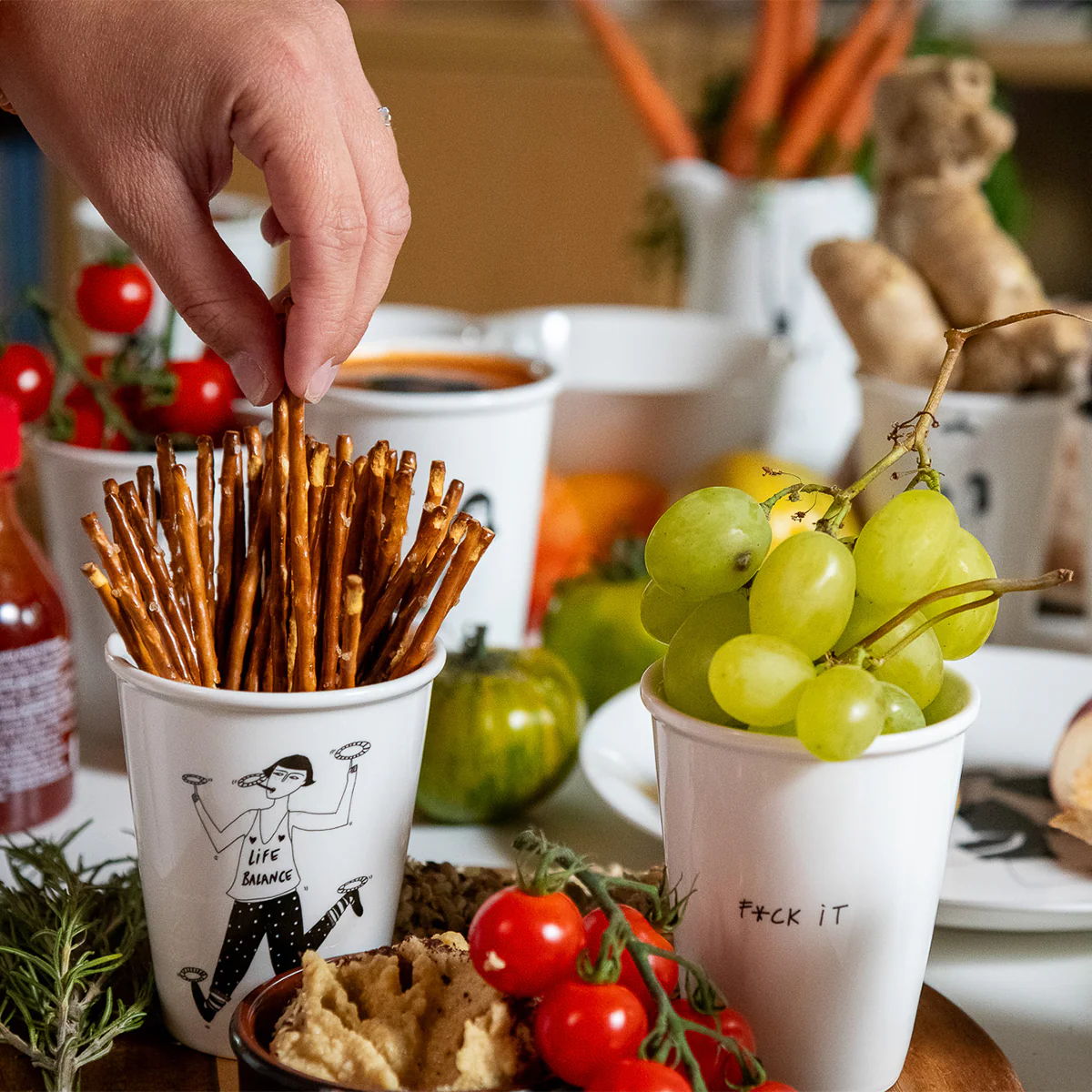 Unikalna kolekcja porcelanowych kubków od belgijskiej artystki Helen Blanchaert to coś więcej niż użytkowy przedmiot – to mała porcja radości na każdy dzień. Każdy kubek jest ręcznie zdobiony i niesie ze sobą charakterystyczny styl Helen: pełen humoru, prostoty i pozytywnego przekazu. Jej rysunki to odzwierciedlenie codziennych chwil, relacji, marzeń i małych absurdów, które budzą uśmiech i zapraszają do refleksji.