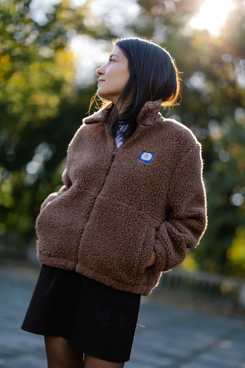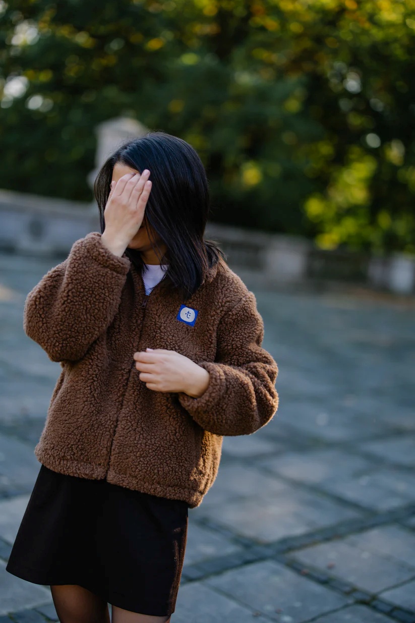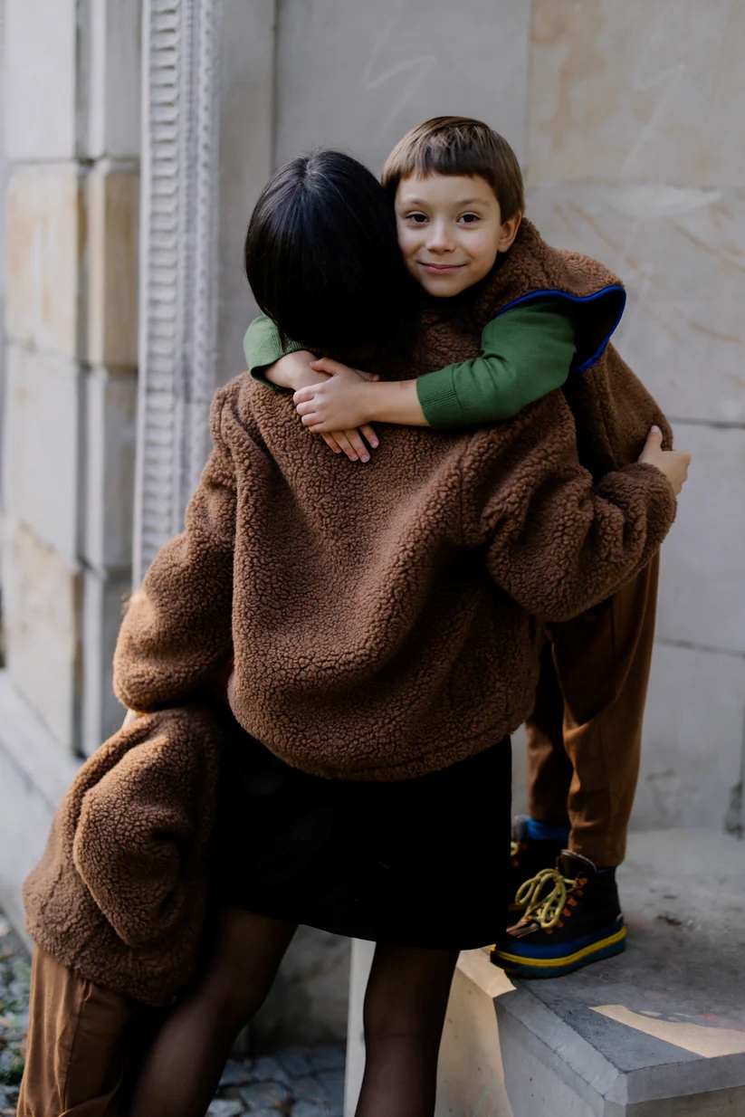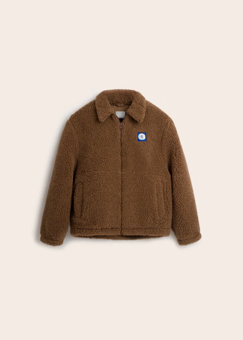 Luźny, oversize’owy krój zapewnia swobodę i wygodę, a zapięcie na suwak – funkcjonalność. Kobaltowa naszywka z logo dodaje charakteru, a brązowa lamówka elegancko podkreśla formę. Wnętrze wykończone z dbałością o detale – wszystkie szwy obszyte lamówką, a tkana wszywka z miejscem na imię to subtelny, osobisty akcent, inspirowany wersją dziecięcą.