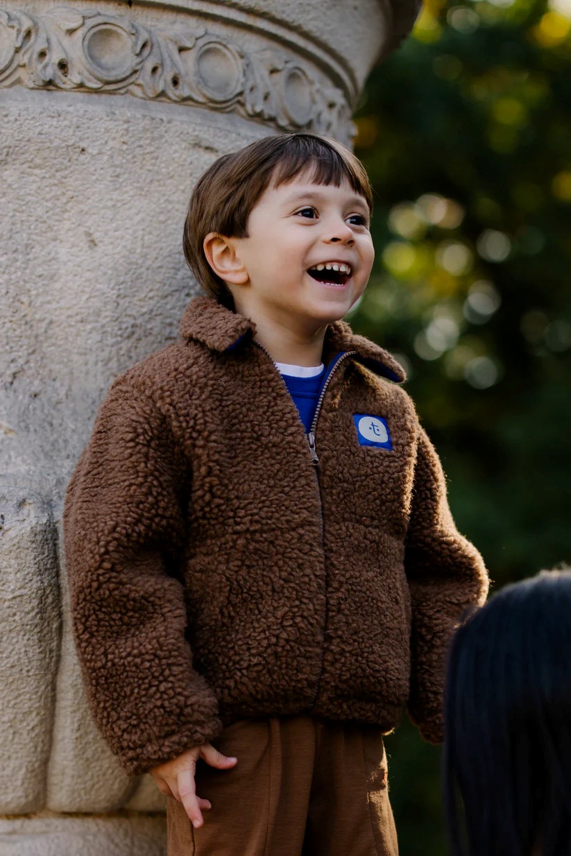 Luźny, pudełkowy fason oversize i praktyczne zapięcie na suwak zapewniają wygodę ruchów i łatwość zakładania. Kobaltowa lamówka podkreśla linię kurtki, a naszywka z logo na piersi dodaje charakteru. Wnętrze dopracowane w każdym szczególe – wszystkie szwy starannie obszyte, a tkana wszywka z miejscem na imię wprowadza osobisty, dziecięcy akcent.
