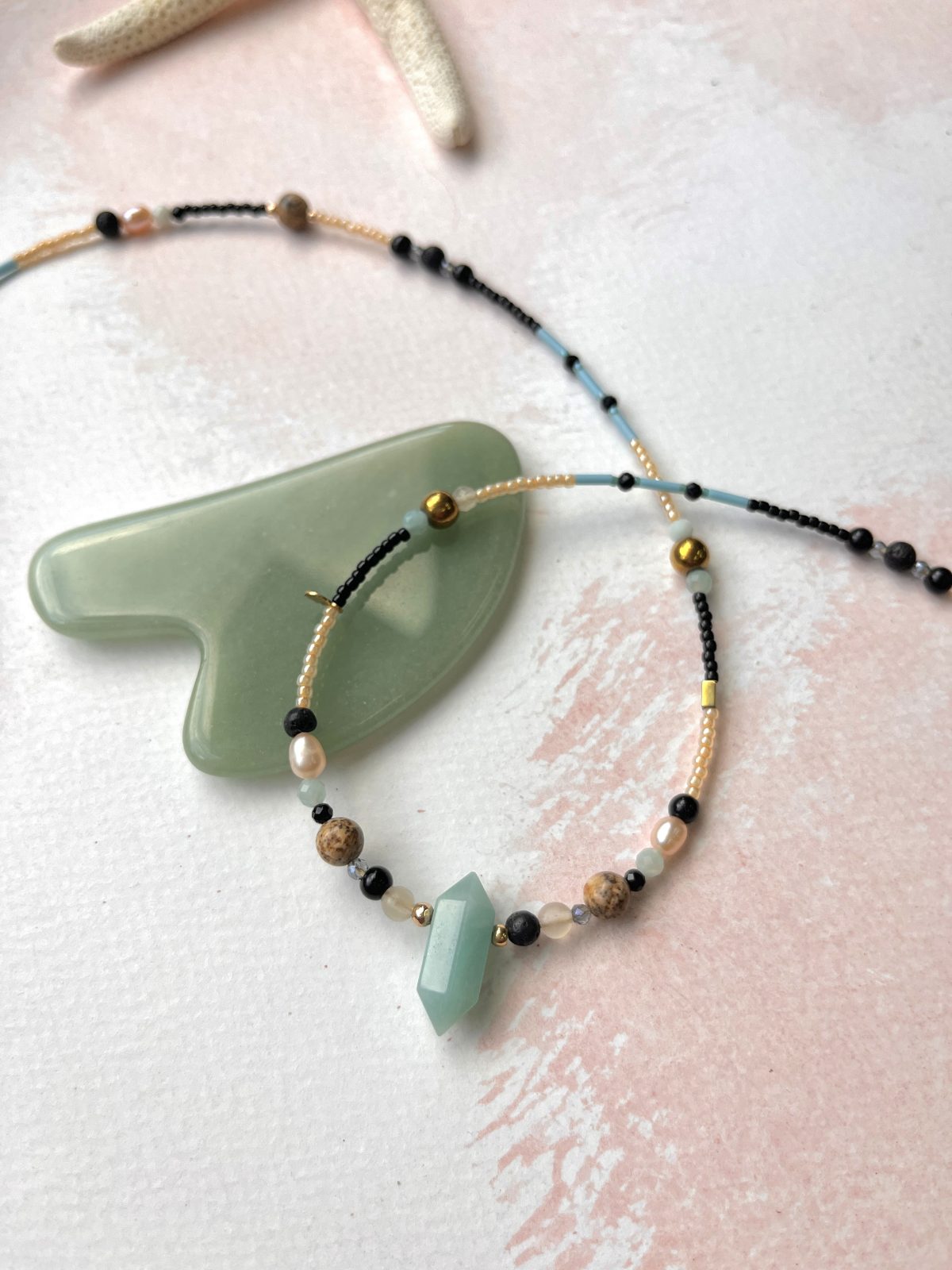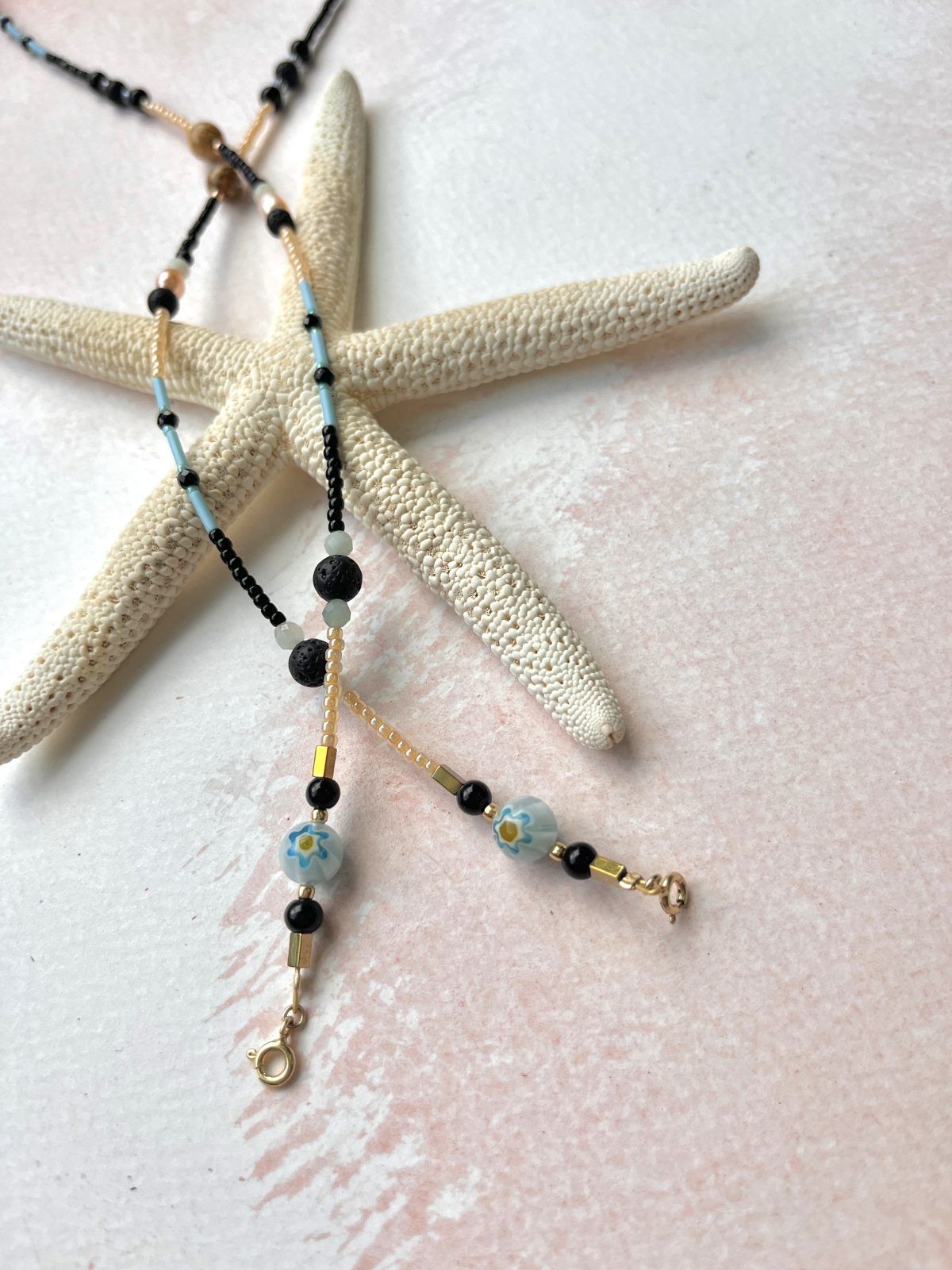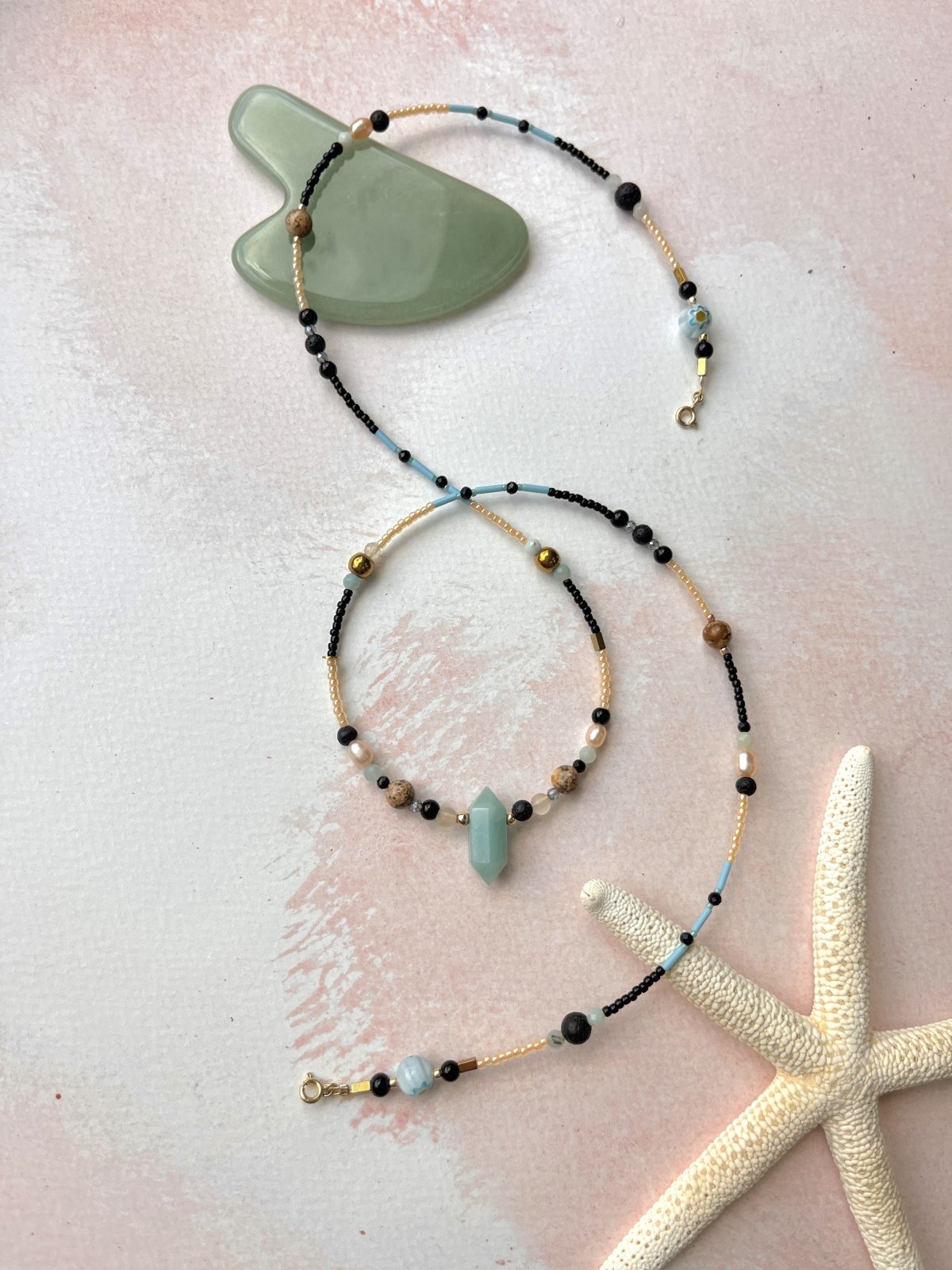 Łańcuszek Watercolor Ocean zawiera: hematyt, szkło Murano, skamieniałą lawę wulkaniczną, amazonit, perłę, jaspis, agat, spinel oraz srebro 925 pozłacane 24k złotem.