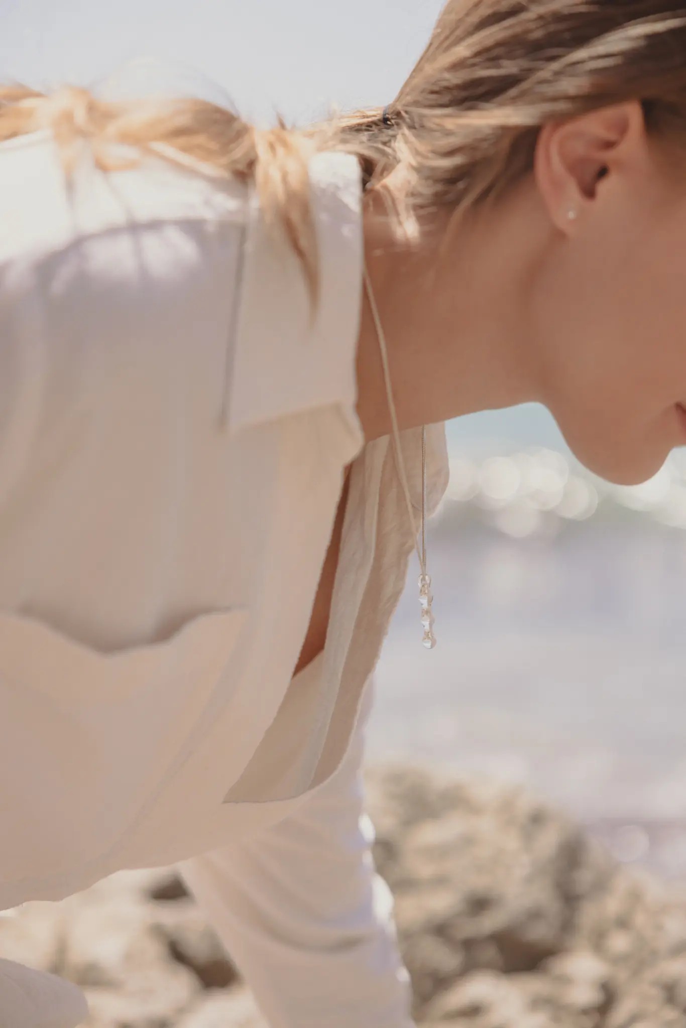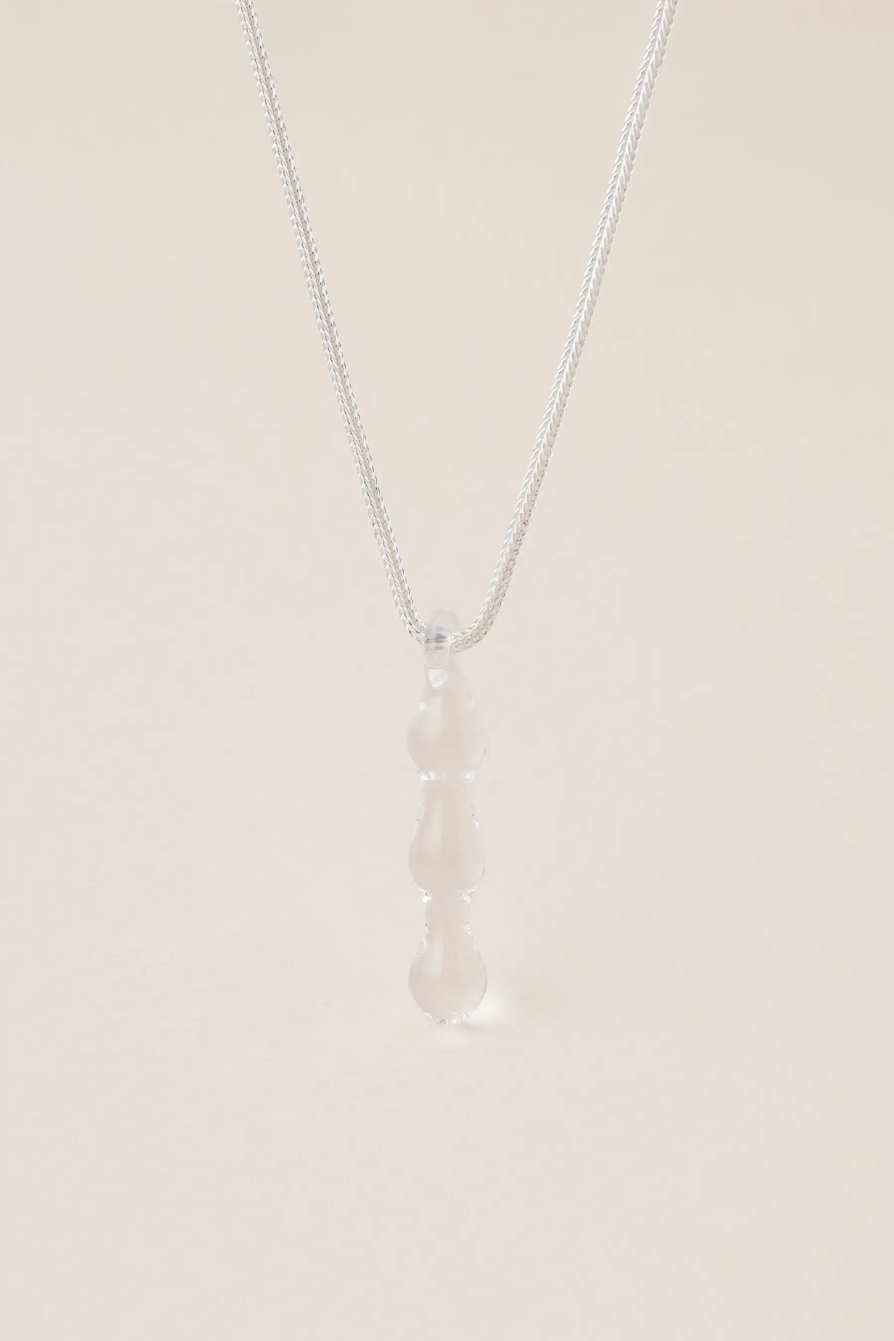 Naszyjnik Sople srebrny to projekt Magdaleny Paszkiewicz – artystki, która w swojej twórczości łączy współczesne rzemiosło z poetycką refleksją nad naturą. To część kolekcji AQUA – inspirowanej wodą w jej najsubtelniejszych formach. Ręcznie formowany szklany element przypomina zamarzniętą kroplę lub sopel lodu, a delikatny srebrny łańcuszek nadaje całości eleganckiej lekkości.