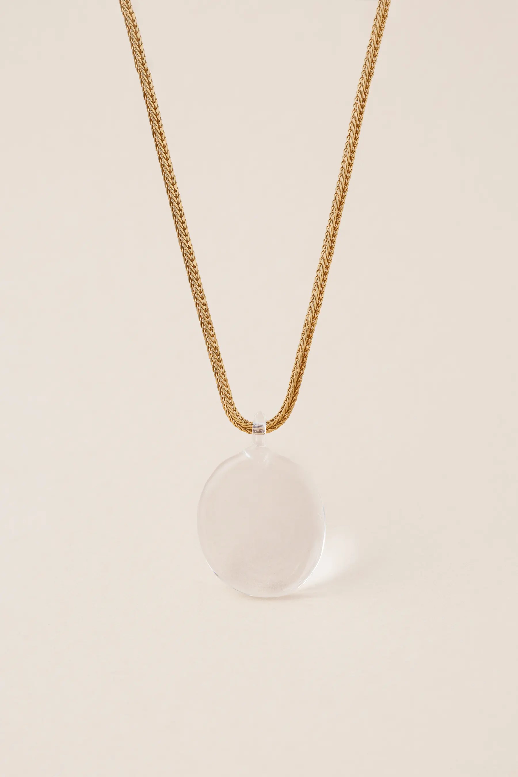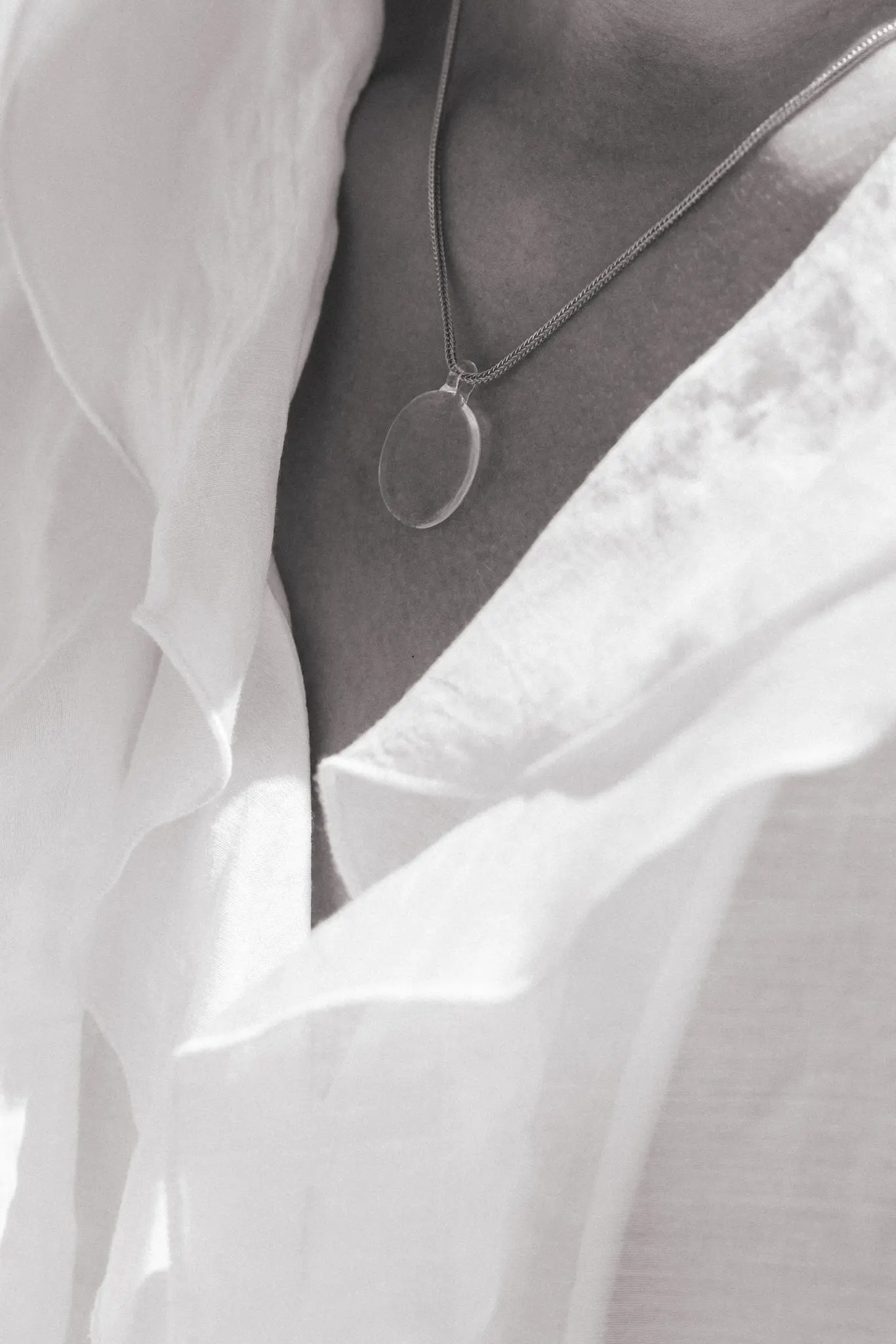 Naszyjnik Tafla pozłacany to projekt Magdaleny Paszkiewicz – artystki, która w swojej pracy łączy nowoczesne rzemiosło z intuicyjnym podejściem do form inspirowanych naturą. To część kolekcji AQUA – zainspirowanej wodą i jej nieuchwytnym pięknem. Ręcznie formowany szklany element przypomina taflę jeziora zatrzymaną w ruchu, a delikatny, pozłacany łańcuszek dopełnia subtelną całość.