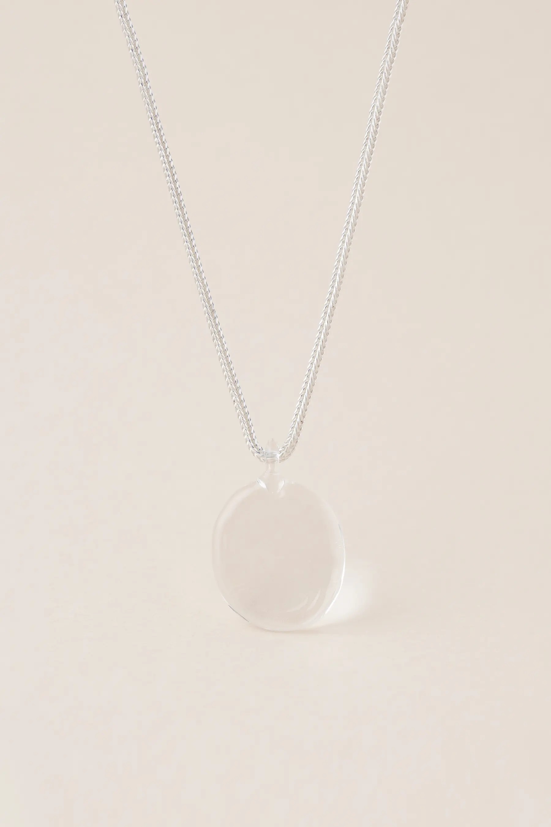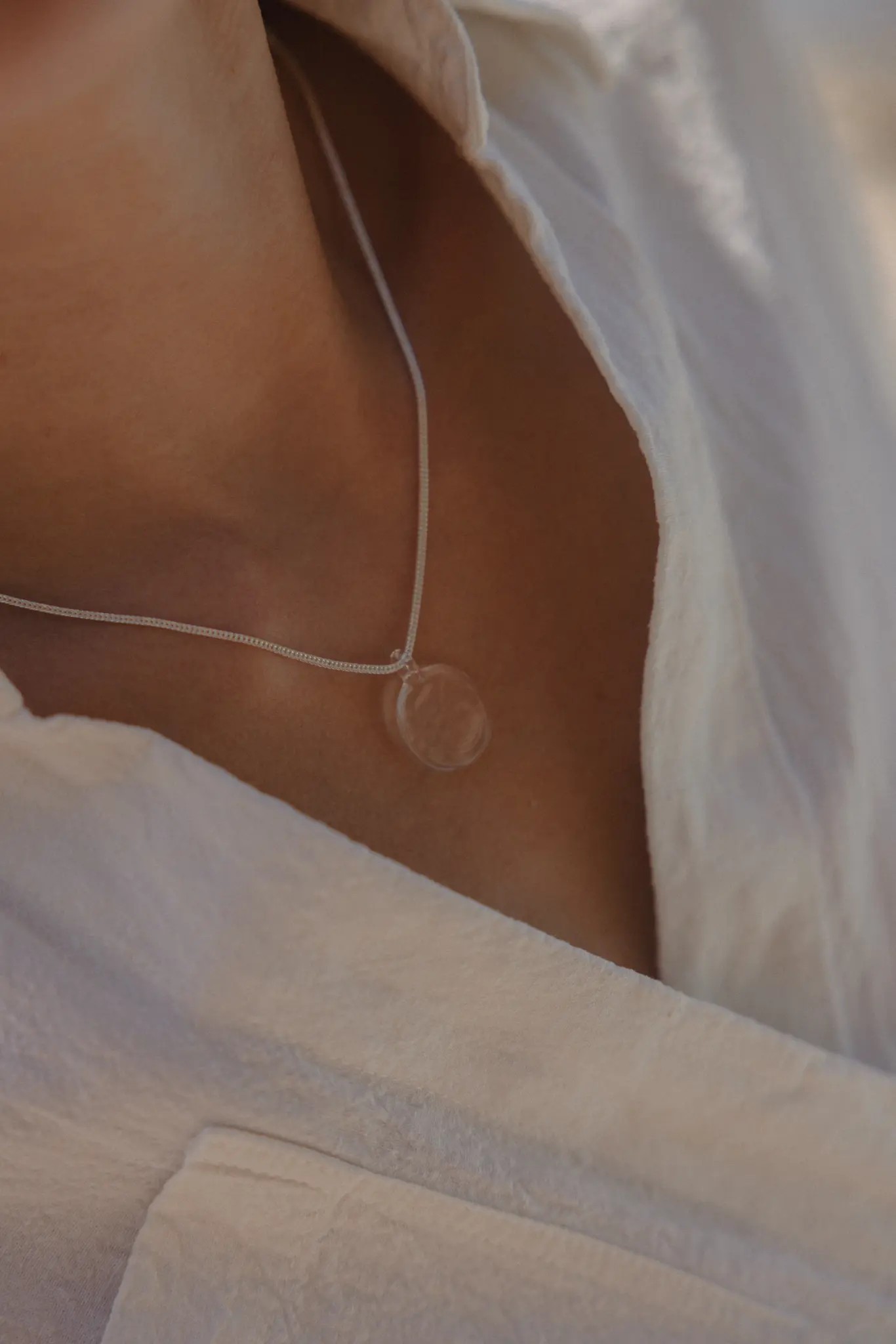 Naszyjnik Tafla srebrny to projekt Magdaleny Paszkiewicz – artystki, która z czułością oddaje w biżuterii zjawiska obecne w naturze. To część kolekcji AQUA – inspirowanej wodą i jej ulotnym pięknem. Ręcznie formowany szklany element przypomina taflę wody poruszoną delikatnym podmuchem, a prosty srebrny łańcuszek dodaje całości subtelności i elegancji.