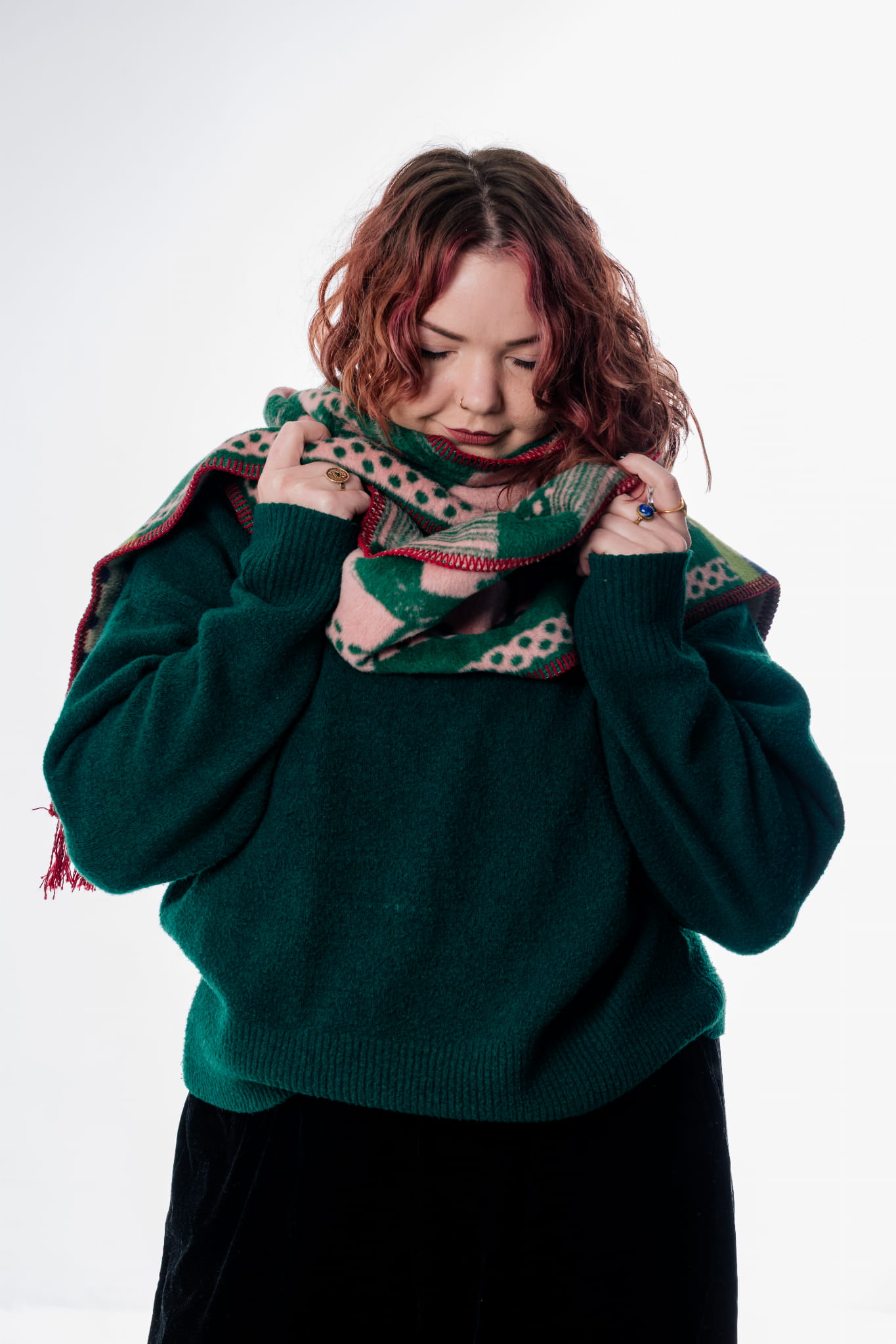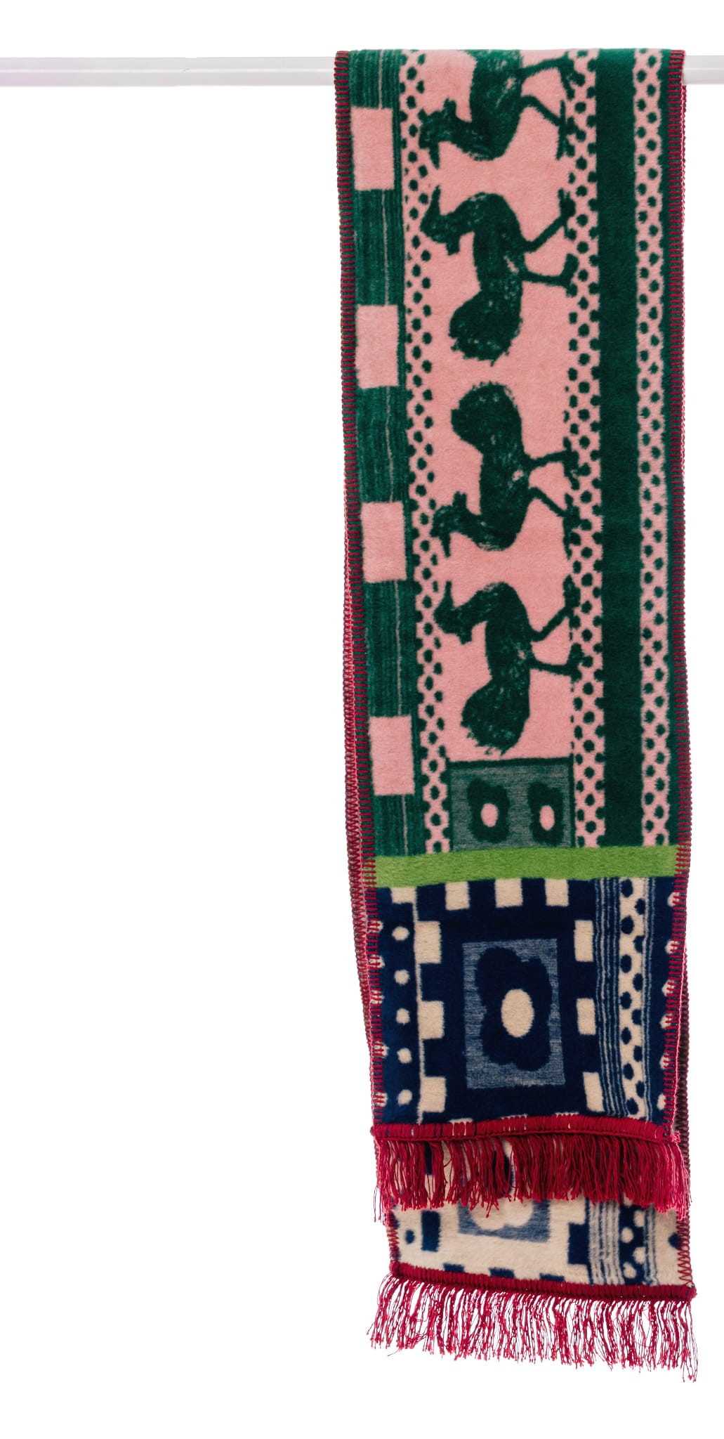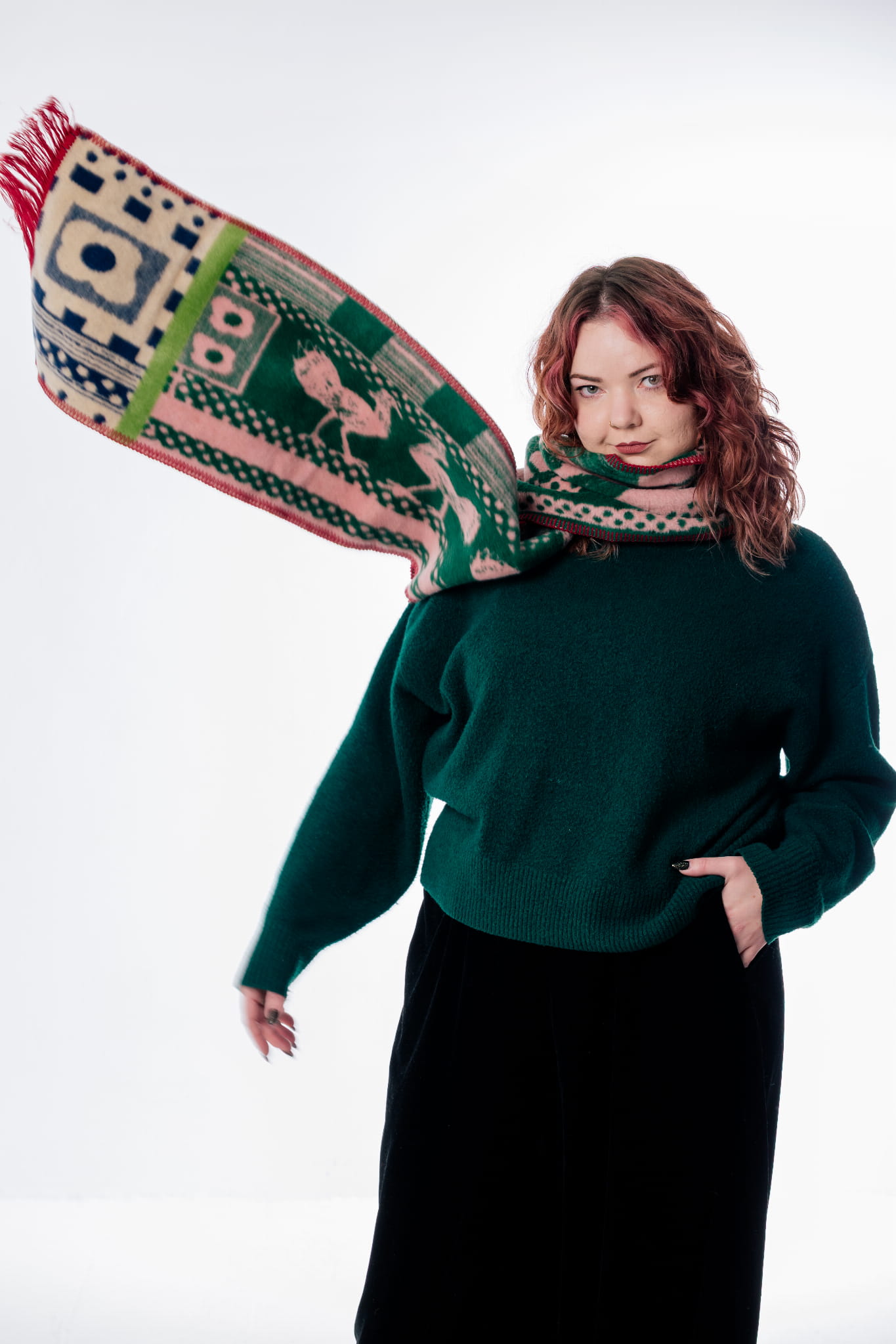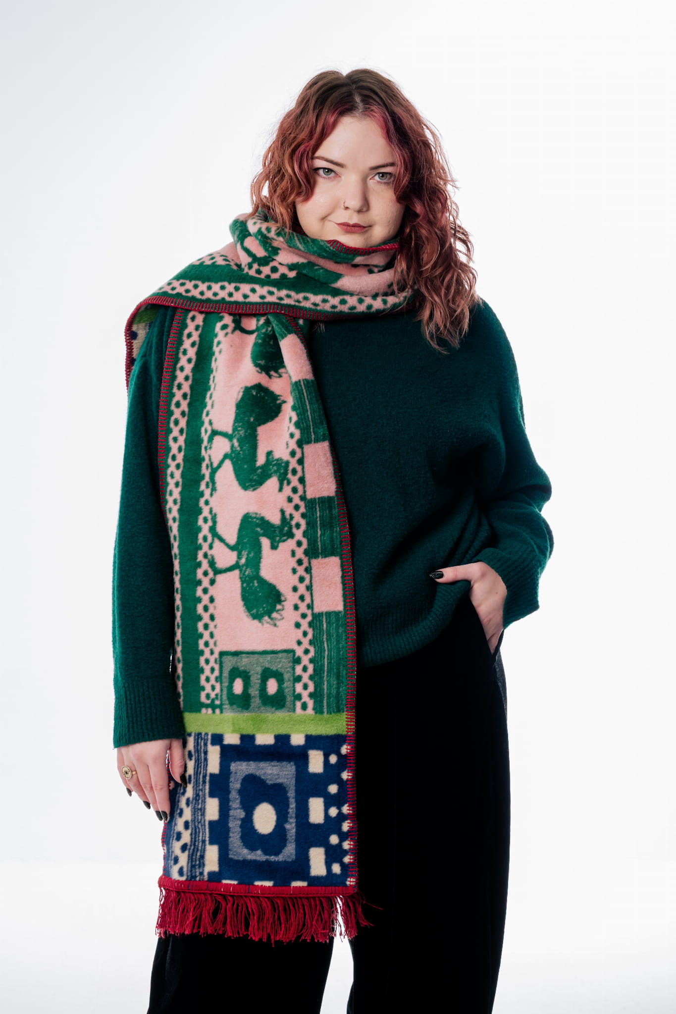 Wyjątkowo długi szalik od polskiej marki Szmat Skład, z hipnotyzującym wzorem i nasyconymi kolorami. Ciepły, miękki i utkany z żakardu – idealny na zimowe spacery i prezent z charakterem.
