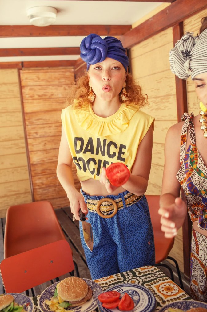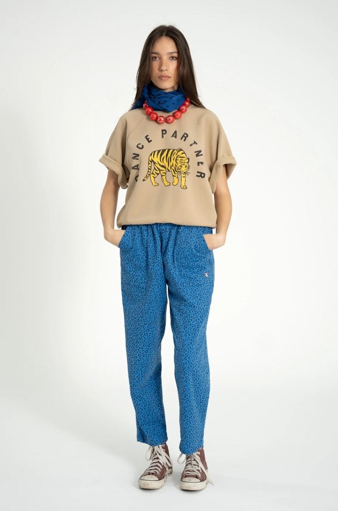 Niebieska baza z wyrazistym zwierzęcym nadrukiem przyciąga uwagę i nadaje stylizacjom charakteru. Spodnie świetnie wyglądają w zestawieniu z prostym t-shirtem, minimalistyczną koszulą czy luźnym swetrem – tworząc miejski, lekko artystyczny look.