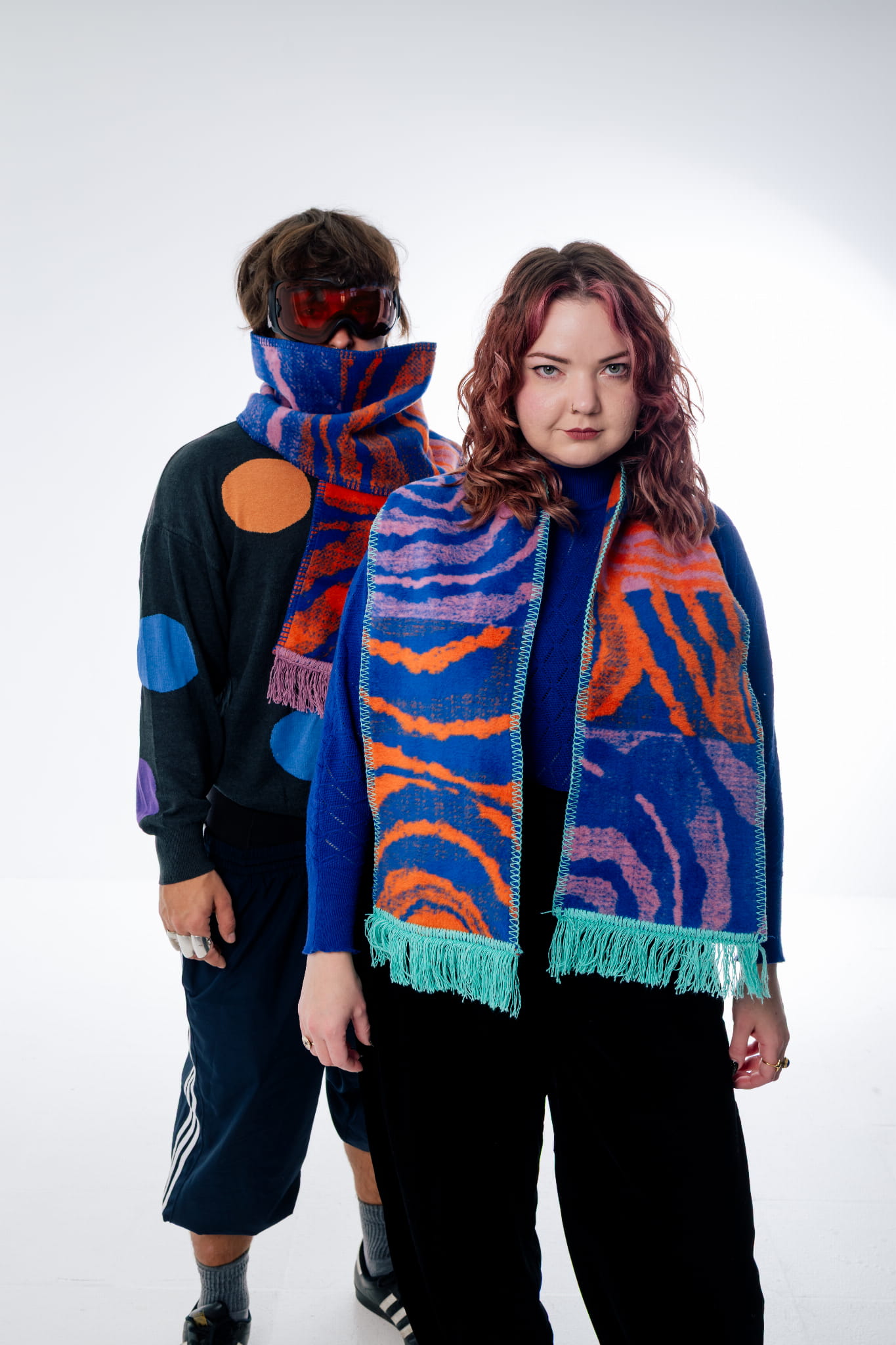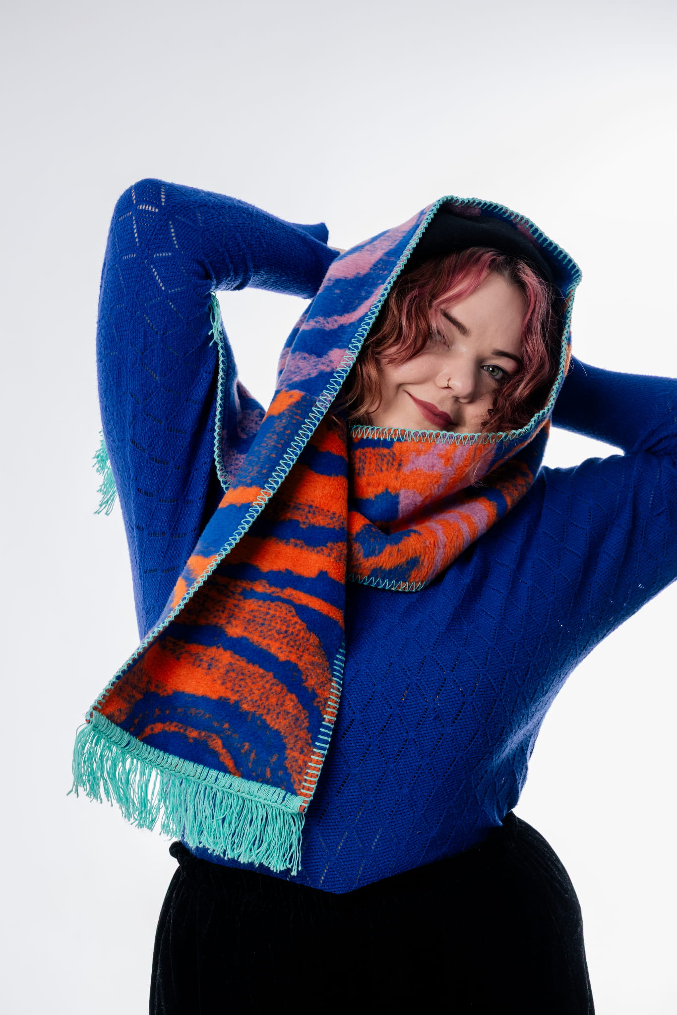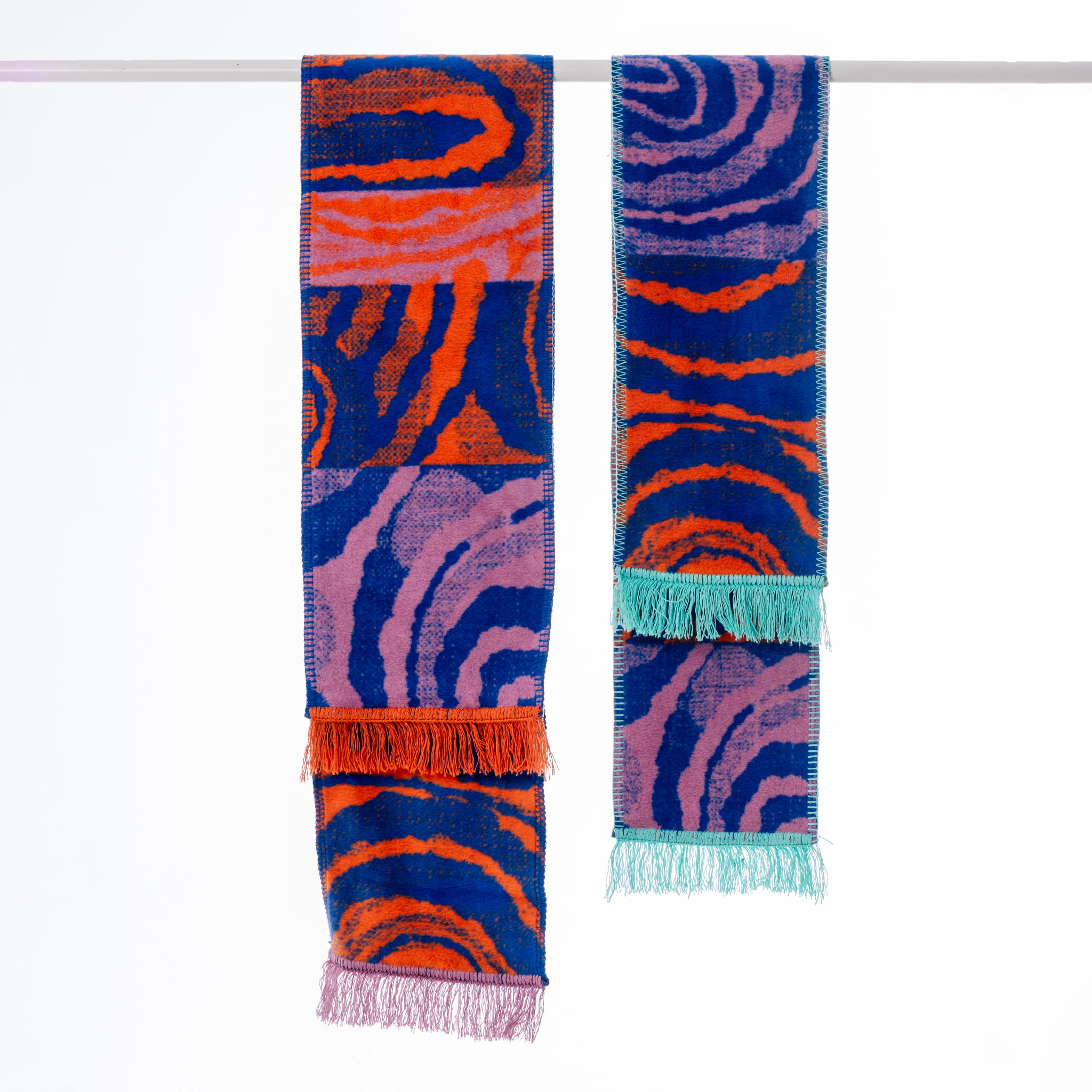 Wyrazisty szalik w malinowo-pomarańczowo-fioletowej kolorystyce od polskiej marki Szmat Skład. Zakończony beżowymi frędzlami i ozdobiony autorskim wzorem Zarii Mielińskiej, tka się bezpośrednio w materiale, co czyni go dwustronnym, grubym i niezwykle trwałym.