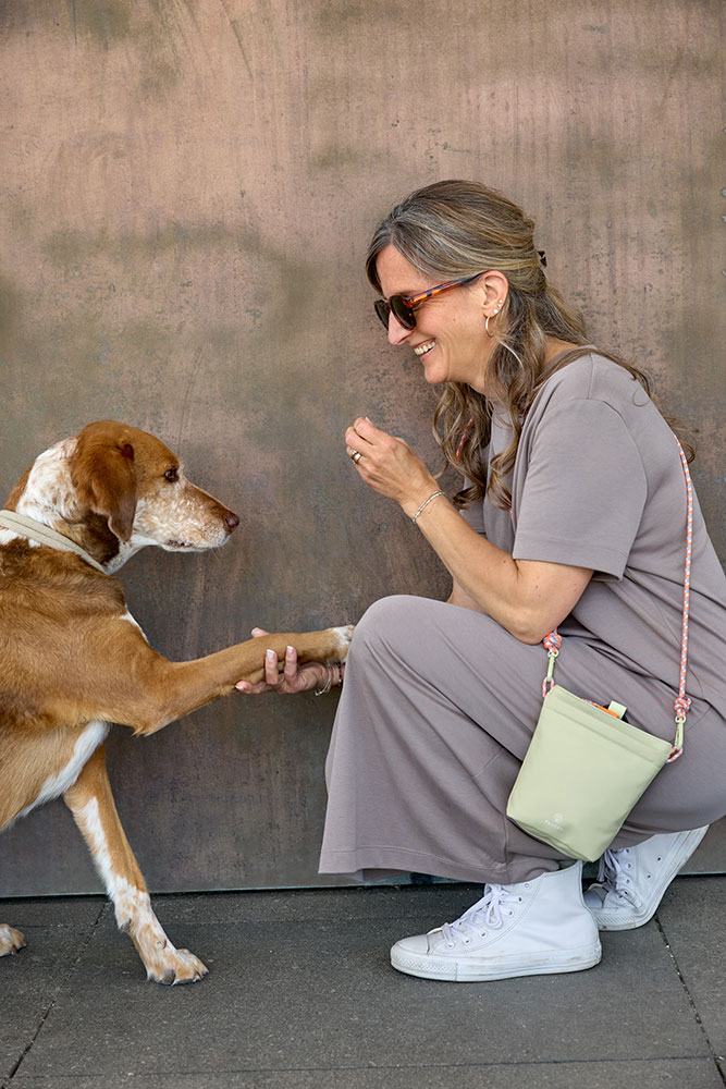 Możesz nosić ją na szyi, na ramieniu lub przypiąć do paska za pomocą karabińczyka – tak, jak jest Ci najwygodniej. Przednia kieszonka z magnetycznym zapięciem zapewnia szybki dostęp do smakołyków, a przemyślana przegroda na woreczki umieszczona u dołu torby gwarantuje dyskretne i praktyczne rozwiązanie.