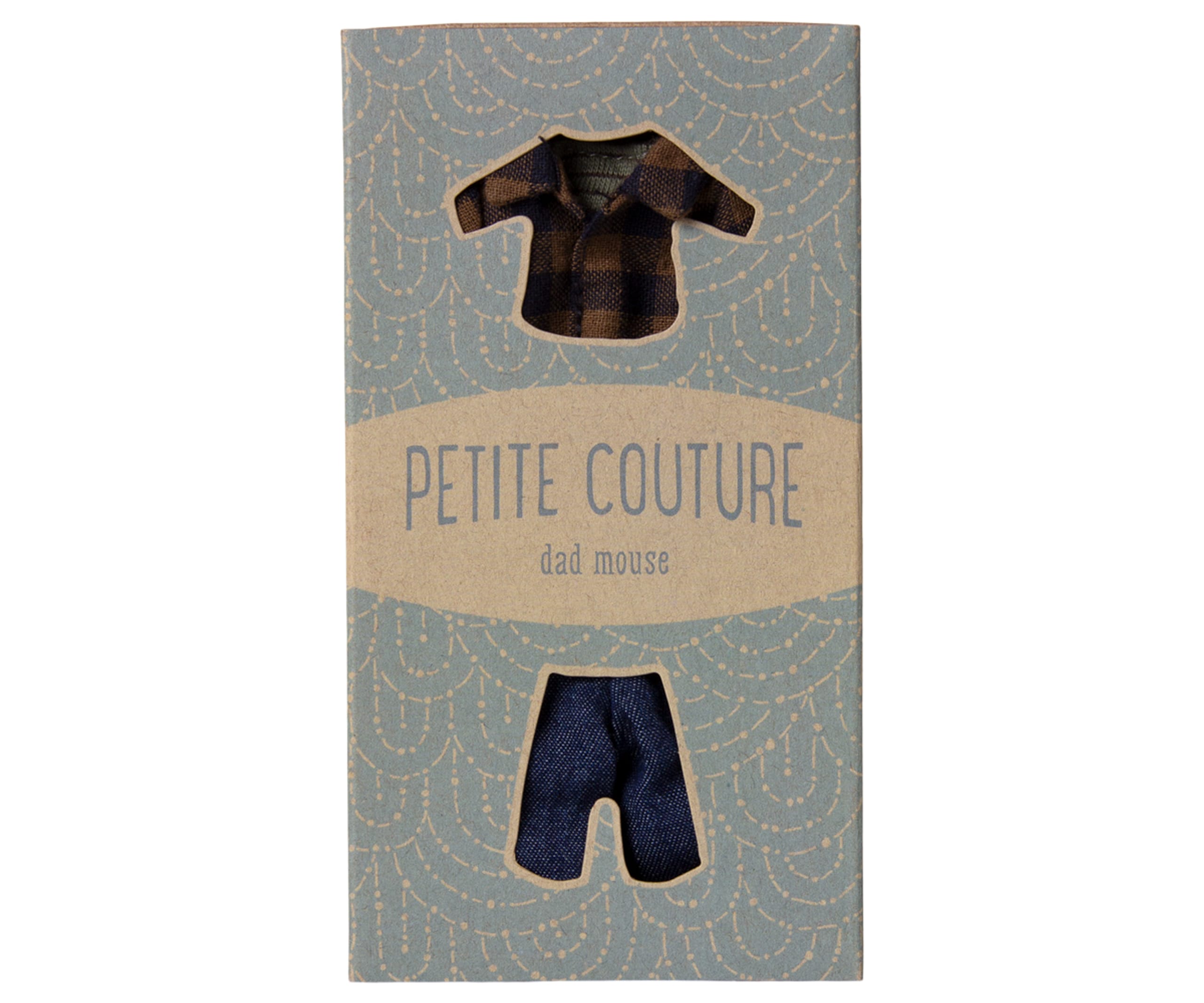 Zestaw dla Taty Myszki od Maileg to klasyczna stylizacja na każdą okazję. Koszula w brązową kratę, miękki podkoszulek i wygodne spodnie tworzą codzienny, swobodny strój z nutą elegancji – idealny do rodzinnych spacerów, czytania gazetki w fotelu lub wyprawy po ser.