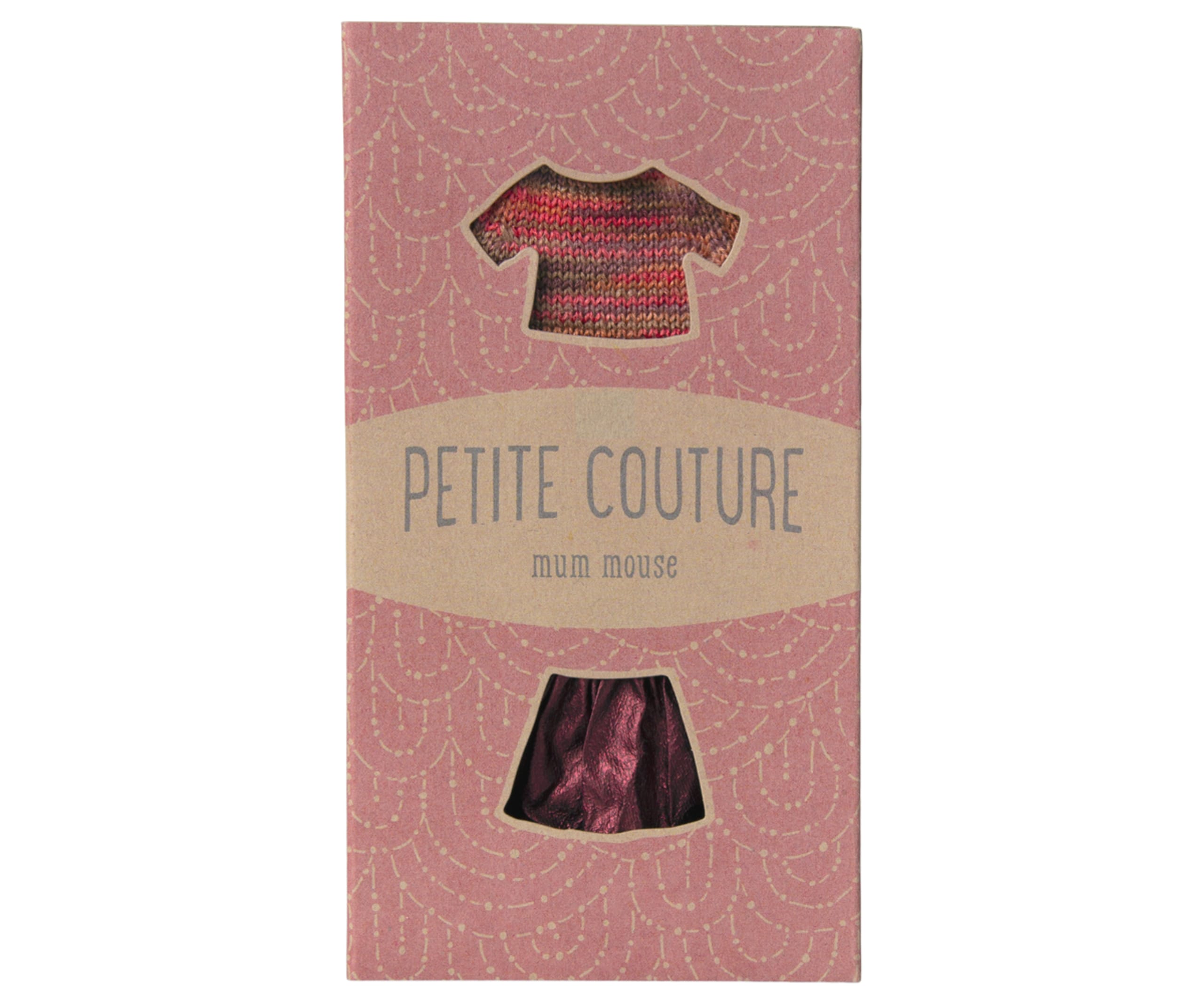 Dzianinowy komplet dla Mamy Myszki od Maileg to elegancka propozycja do mysiej garderoby. Miękka bluzka w subtelnych barwach zestawiona z połyskującą, różową spódniczką tworzy stylizację idealną na spacer, przyjęcie czy codzienne domowe obowiązki.