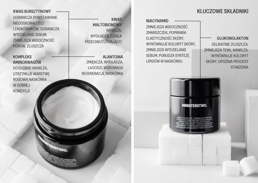 Słodka pielęgnacja, która działa! Maska-krem „Cukier” z kwasem bursztynowym to wyjątkowy kosmetyk do twarzy, szyi i dekoltu o kremowej, odżywczej konsystencji i hipnotyzującym zapachu waty cukrowej. Stworzona z myślą o cerach potrzebujących intensywnego nawilżenia, regeneracji, wygładzenia i zdrowego blasku, łączy w sobie działanie maski, kremu na noc i punktowej kuracji na niedoskonałości.
